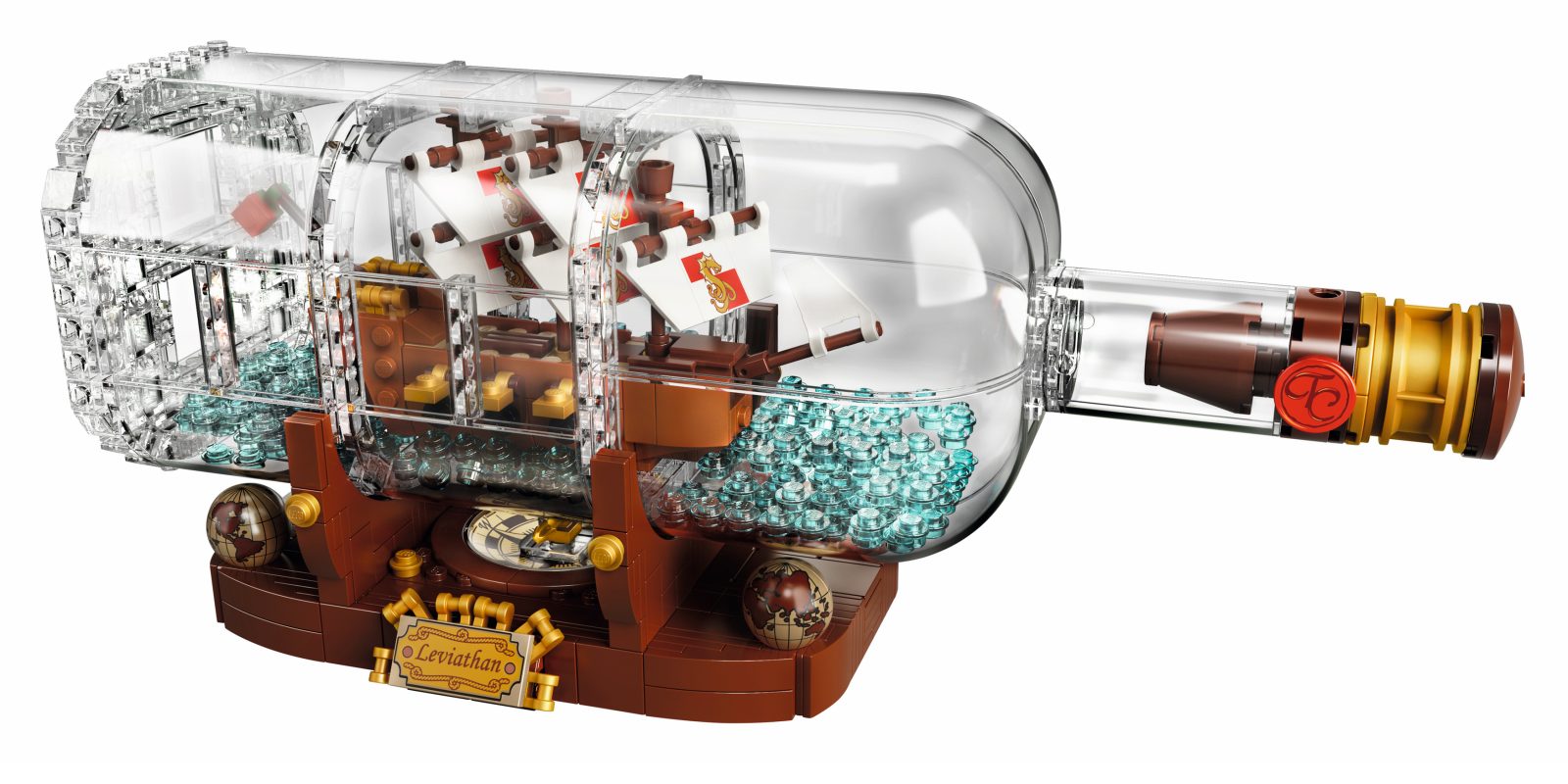 Build and display a classic LEGO® Ideas Ship in a Bottle, featuring a highly detailed ship with the captain’s quarters, cannons, masts, crow’s nest, flag and printed sail elements. Place the ship inside the LEGO brick-built bottle with a buildable cork, wax seal element and water-style elements inside, then showcase it on the display stand featuring the ship’s ‘Leviathan’ nameplate, globe elements and a built-in ‘compass’ (non-functioning) with compass rose and spinning needle. This wonderfully nostalgic construction toy also includes a booklet about the set’s fan creator and LEGO designers.