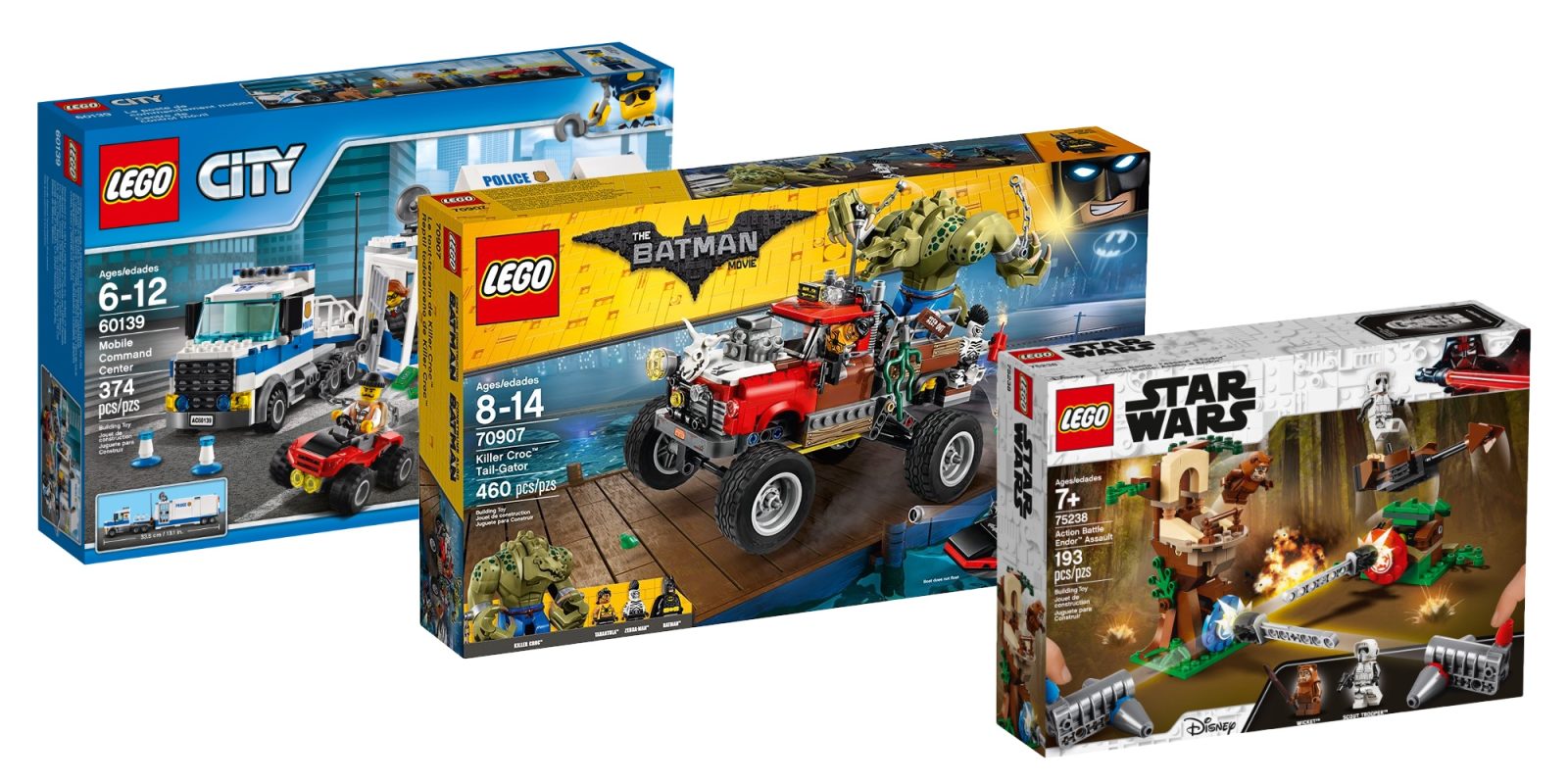 Stage a land-water pursuit of Killer Croc’s Tail-Gator at Gotham City harbor with this action-packed set from THE LEGO BATMAN MOVIE. Help Batman prevent Killer Croc, Zebra-Man and Tarantula from escaping in Croc’s huge Tail-Gator truck featuring big wheels with rubber tires, suspension and two crate bombs. Give chase on Batman’s Batski with two stud shooters. Includes three minifigures with assorted weapons and a big figure.
