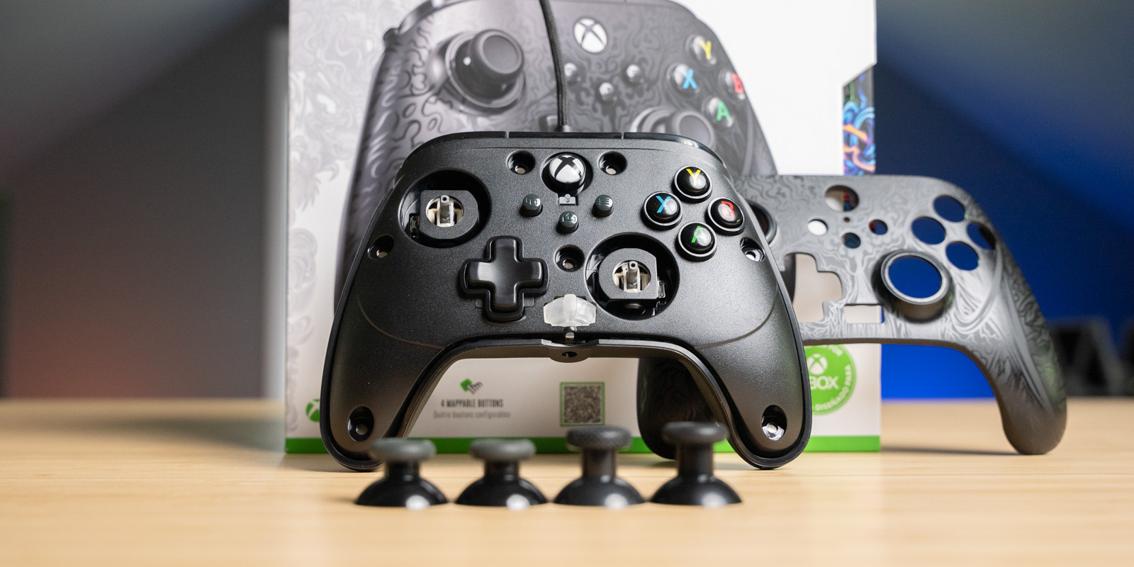 Like other Fusion Pro controllers, the face plate is also removable. With that plate off you can swap the thumbsticks for the taller options that are included in the robust hard carry case.